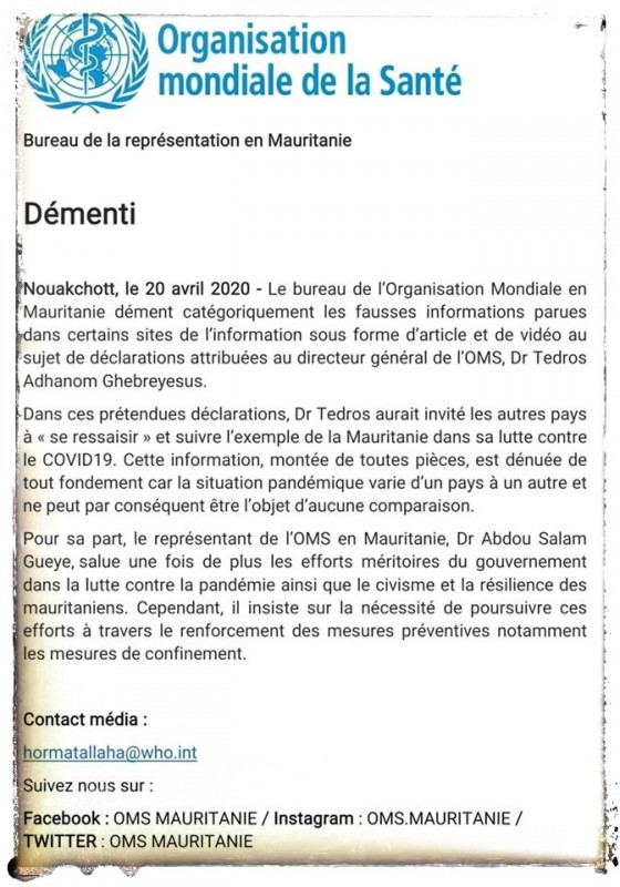 Le bureau pays de l’Organisation Mondiale de la Santé (OMS) « dément catégoriquement les fausses informations et propos véhiculés par certains médias électroniques, sous forme d’articles et vidéos, attribués au Directeur Général de l’OMS, le Dr Tedros Adhanom Gebreyesus invitant les autres pays « à se ressaisir et à suivre l’exemple de la Mauritanie » dans le domaine de la lutte contre le coronavirus (COVID-19).