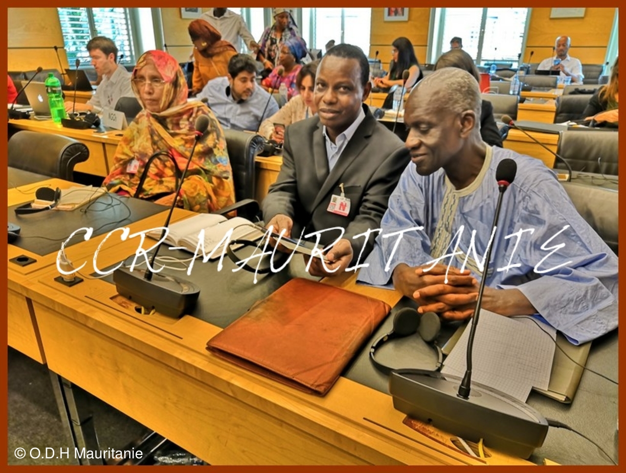 Forte de six membres, la délégation du Cadre de Concertation des Rescapés Mauritaniens, conduite par son Secrétaire général Mamadou Al Housseinou KANE a participé aux travaux de la 126 ième Session des Droits de l'Homme de L'ONU à Genève du 3 au 5 juillet 2019. Parmi les participants au titre du CCR-MAURITANIE : - Mahamadou SY que l'on ne présente plus, auteur de << L'enfer d'Inal>> - Madame Veuve SALL Diary TOUMBO, de tous les combats pour les droits humains - Monsieur Oumar Alassane BÂ, orphelin engagé - Madame Kadiata SOW, Veuve de Mamadou SOW - Madame Kadiata BÂ, Veuve de Amadou Mamadouercredi 3 juillet, 14h00 : réunion avec les Procédures Spéciales (pauvreté et disparitions forcées).Espace membre