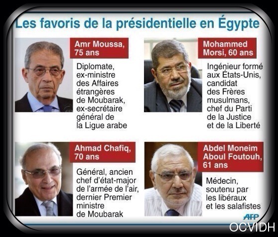 LE CAIRE (AP) ? Le candidat des Frères musulmans, Mohammed Morsi, arriverait en tête du premier tour de l'élection présidentielle en Egypte, et devrait être opposé au second tour à Ahmed Shafiq, ancien commandant de l'armée de l'air et dernier Premier ministre d'Hosni Moubarak, selon des résultats partiels rendus publics vendredi.